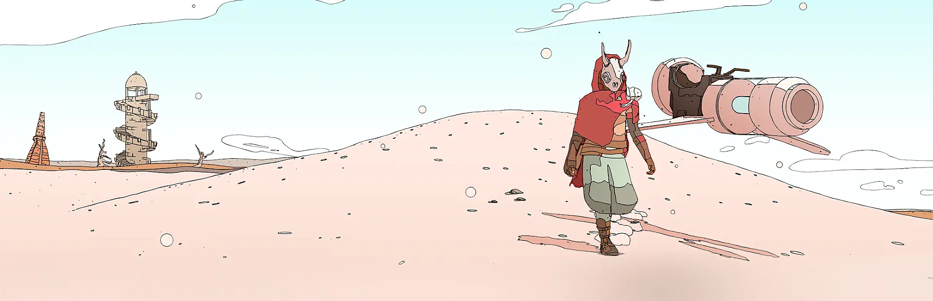 Sable — це тиха, медитативна подорож через дюни, уламки зорельотів та давні артефакти. Ви самі обираєте темп дослідження: підіймайтесь, стрибайте, ковзайте й ширяйте, щоб дістатися до кожної цікавої деталі світу.